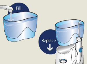 - Start with the lowest pressure setting, lean over the sink, place tip in your mouth.